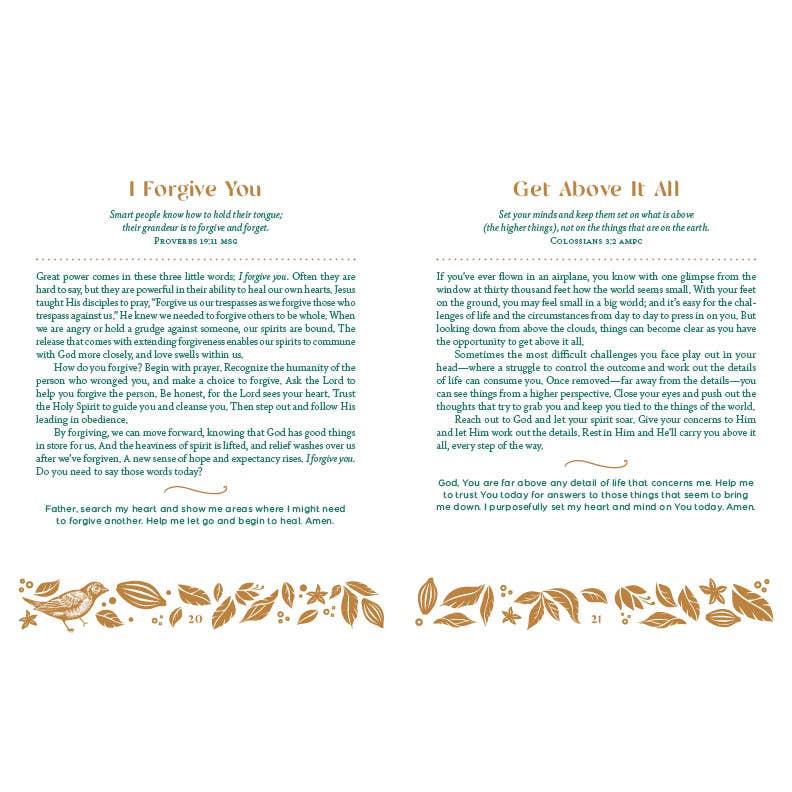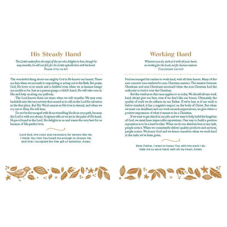 Daily Encouragement and Bible Wisdom for Your Flourishing Faith! This beautiful devotional collection will engage your spirit with Bible wisdom and encouraging devotions. Each day's reading includes a scripture, faith-building reading, and prayer—all designed to draw you closer to your Father God through daily quiet time. This women's devotional is perfect for personal use or makes a thoughtful gift that will be cherished for years to come.