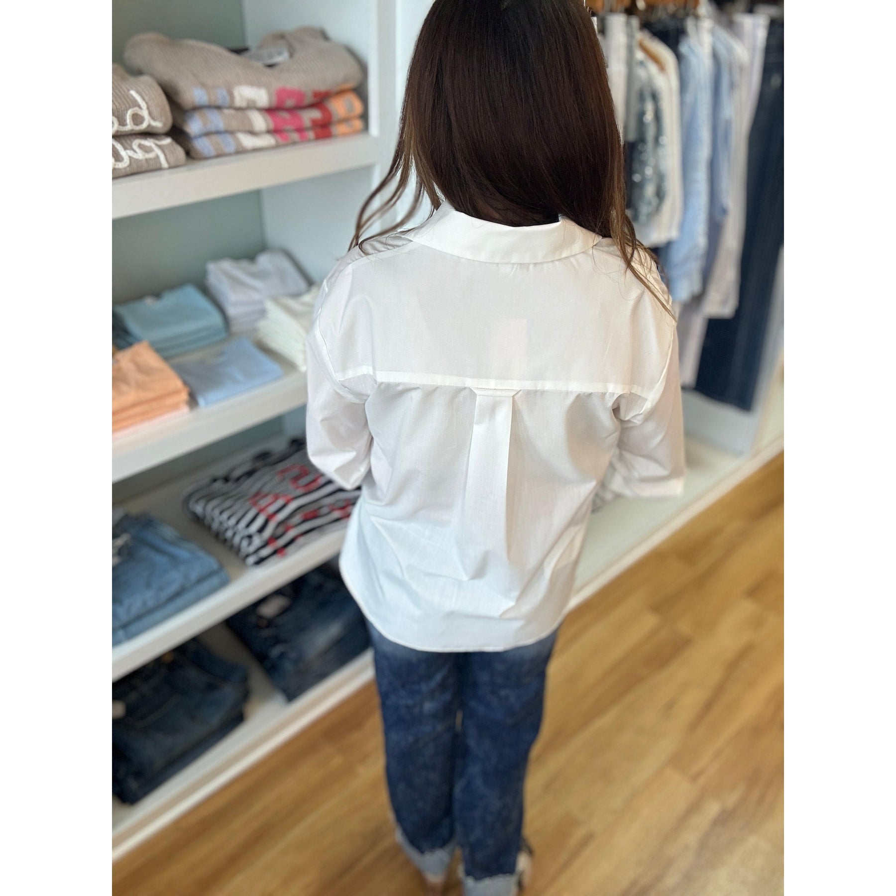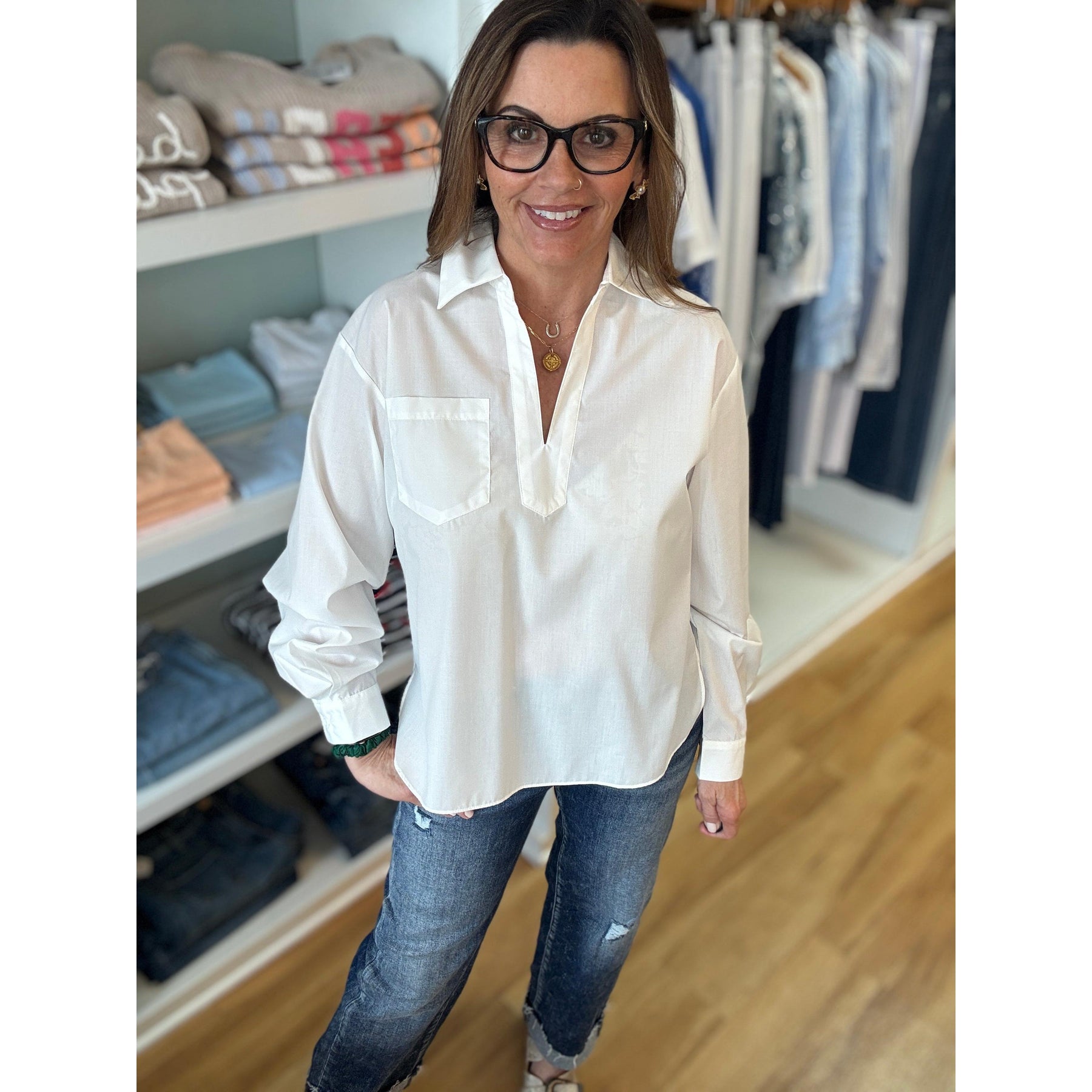 The crisp white colorway brings timeless versatility to your closet, easily transitioning from office meetings to weekend gatherings. The collared design adds a touch of classic sophistication, while the flattering fit ensures you look effortlessly put-together. This blouse embodies modern femininity with a refined, wearable appeal.