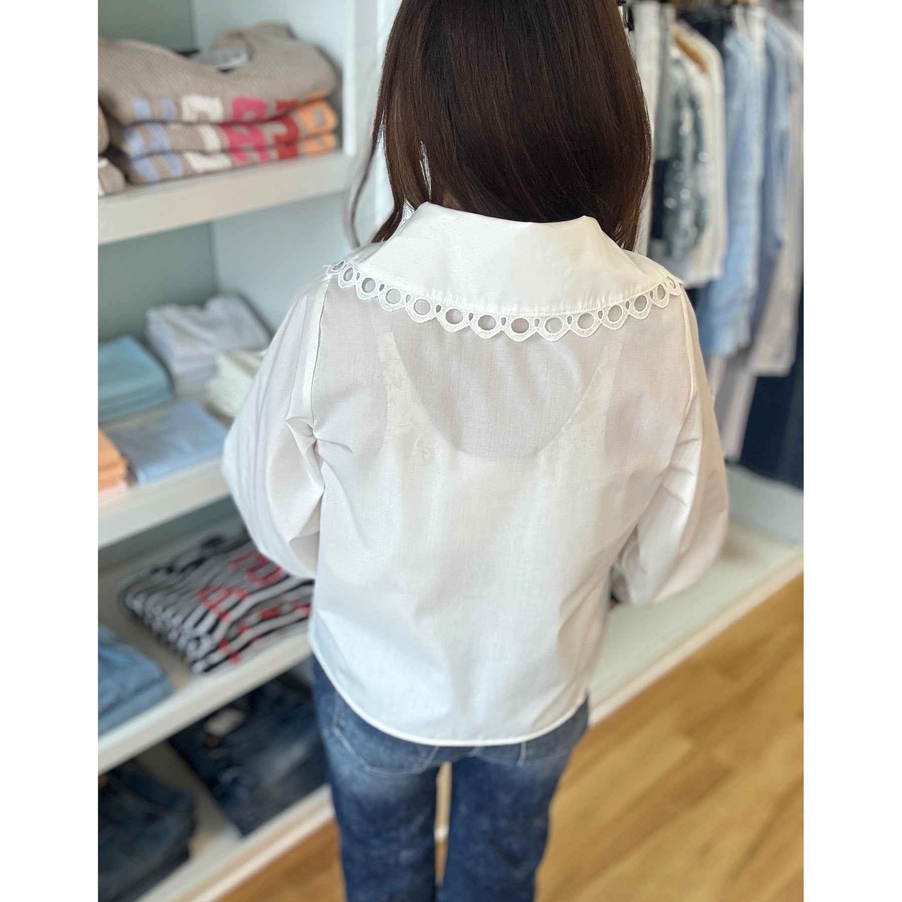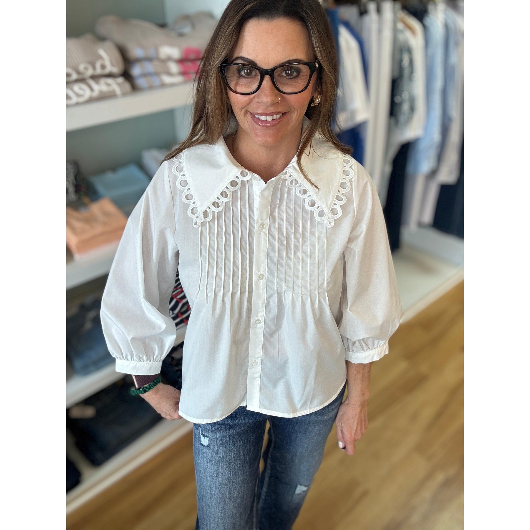 Style this blouse with your favorite high-waisted denim and strappy sandals for a chic casual look, or tuck it into tailored trousers with espadrilles or mules for a polished spring ensemble. The classic white shade pairs beautifully with everything from bold statement jewelry to minimalist accessories, making it a versatile wardrobe essential.