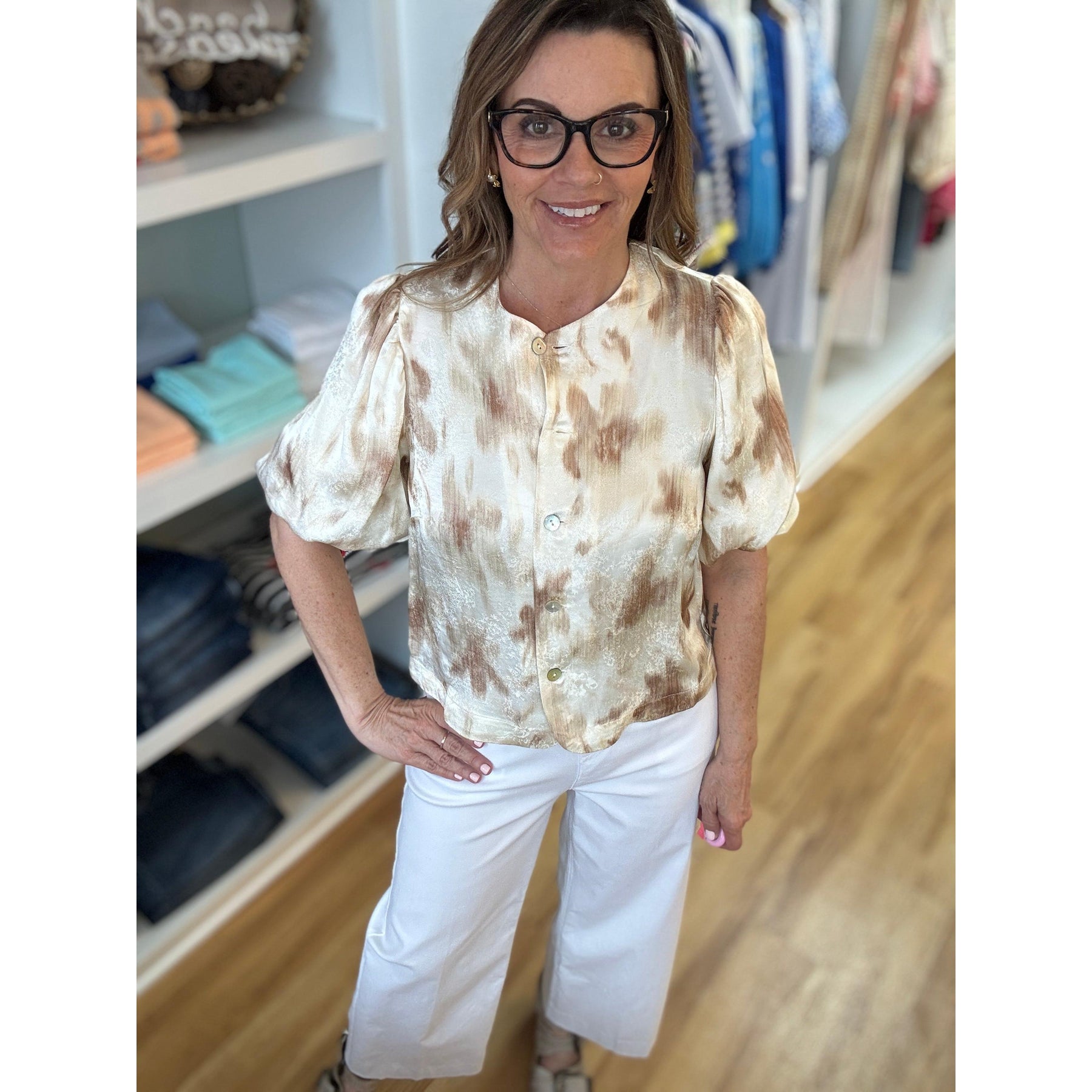 Add a touch of feminine charm to your wardrobe with this round neck button-down, featuring playful short balloon sleeves and a relaxed silhouette. Designed with effortless style in mind, this versatile piece brings modern elegance to everyday dressing with its flattering shape and thoughtful details.