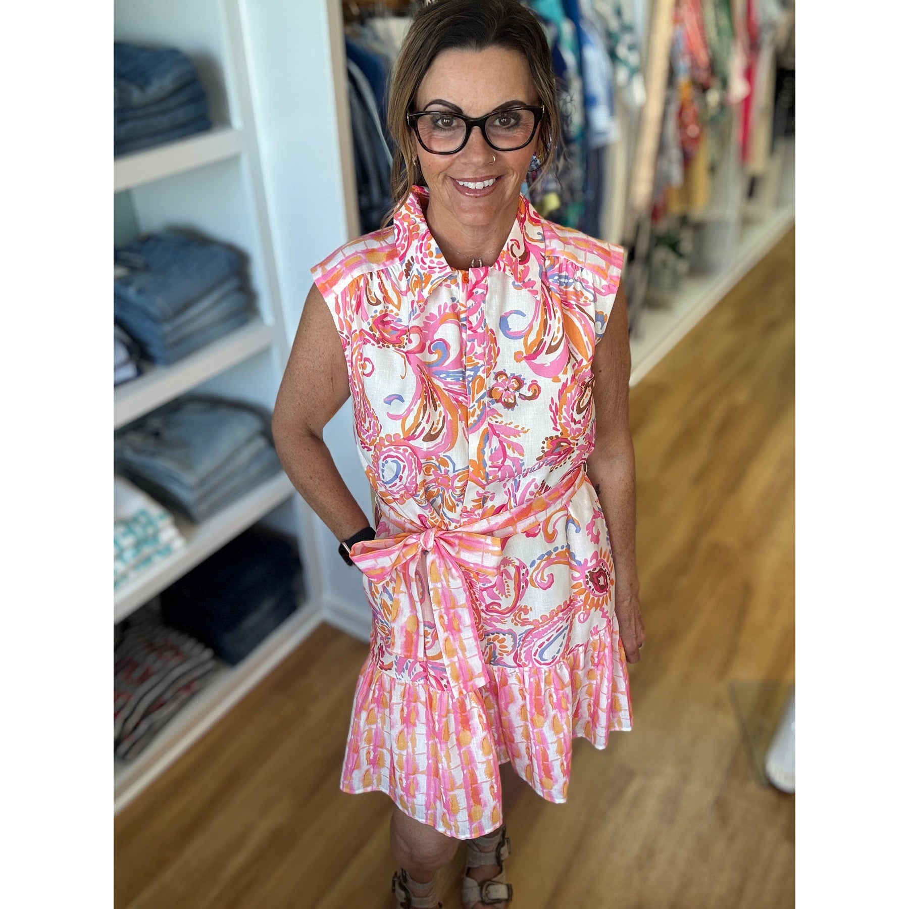 You want a dress that's fun and put-together — but everything feels either too plain or too much. The Joy Joy Contrast Shirtdress in Carnival Paisley is the sweet spot: a vibrant pink, orange, and blue paisley bodice meets a contrast pink gingham ruffle hem for a look that's playful without trying too hard.