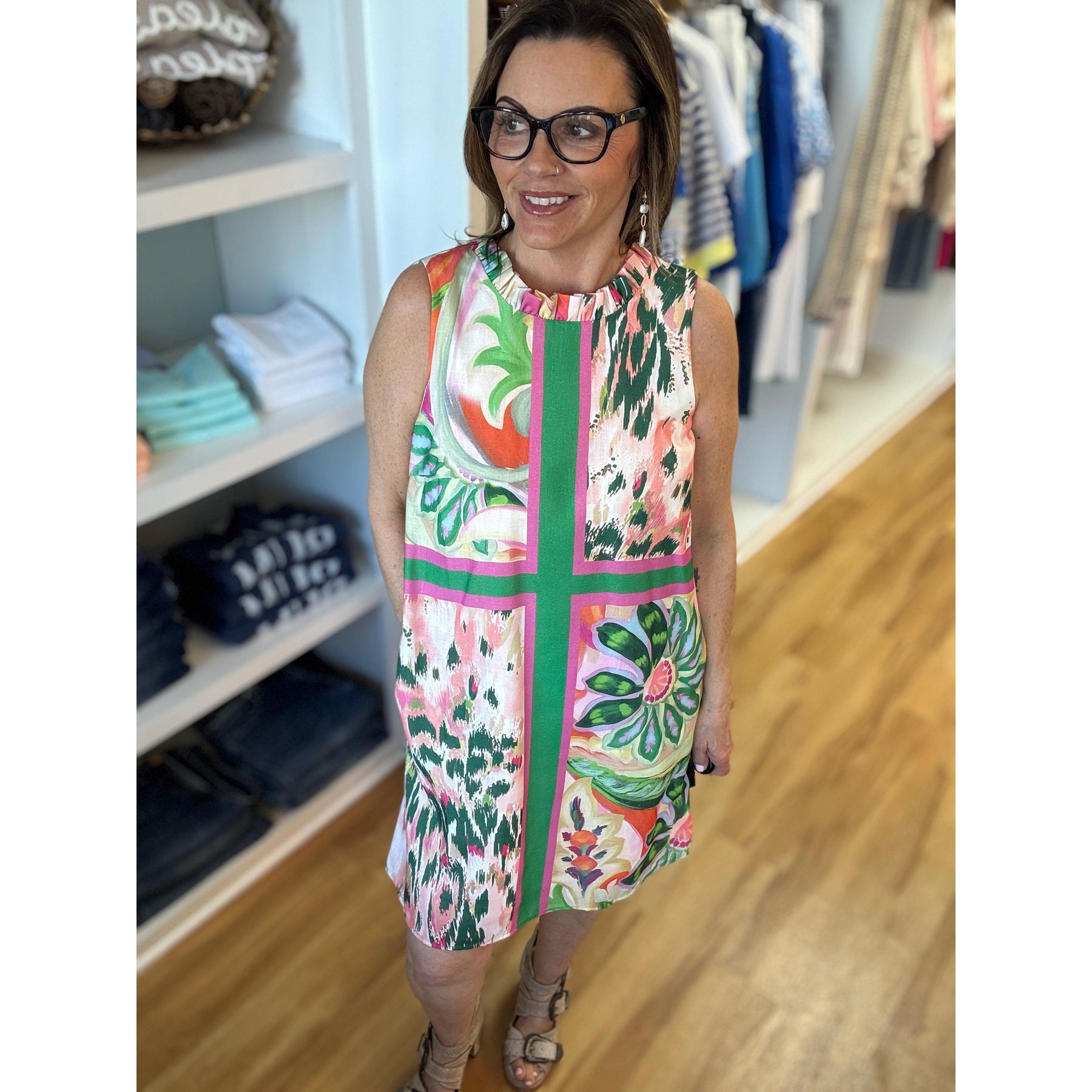 Bold colorful patchwork pattern with ruffled detail neckline