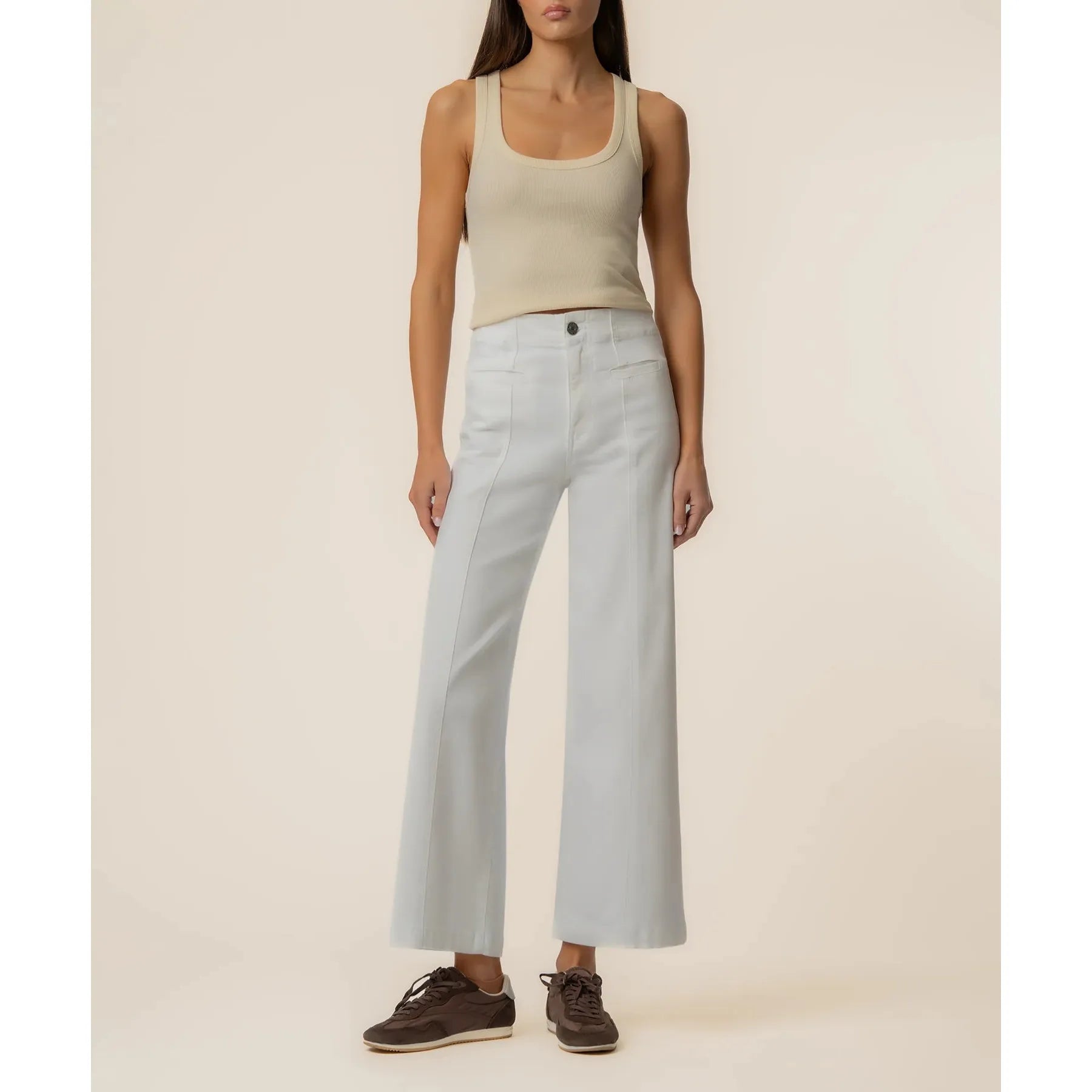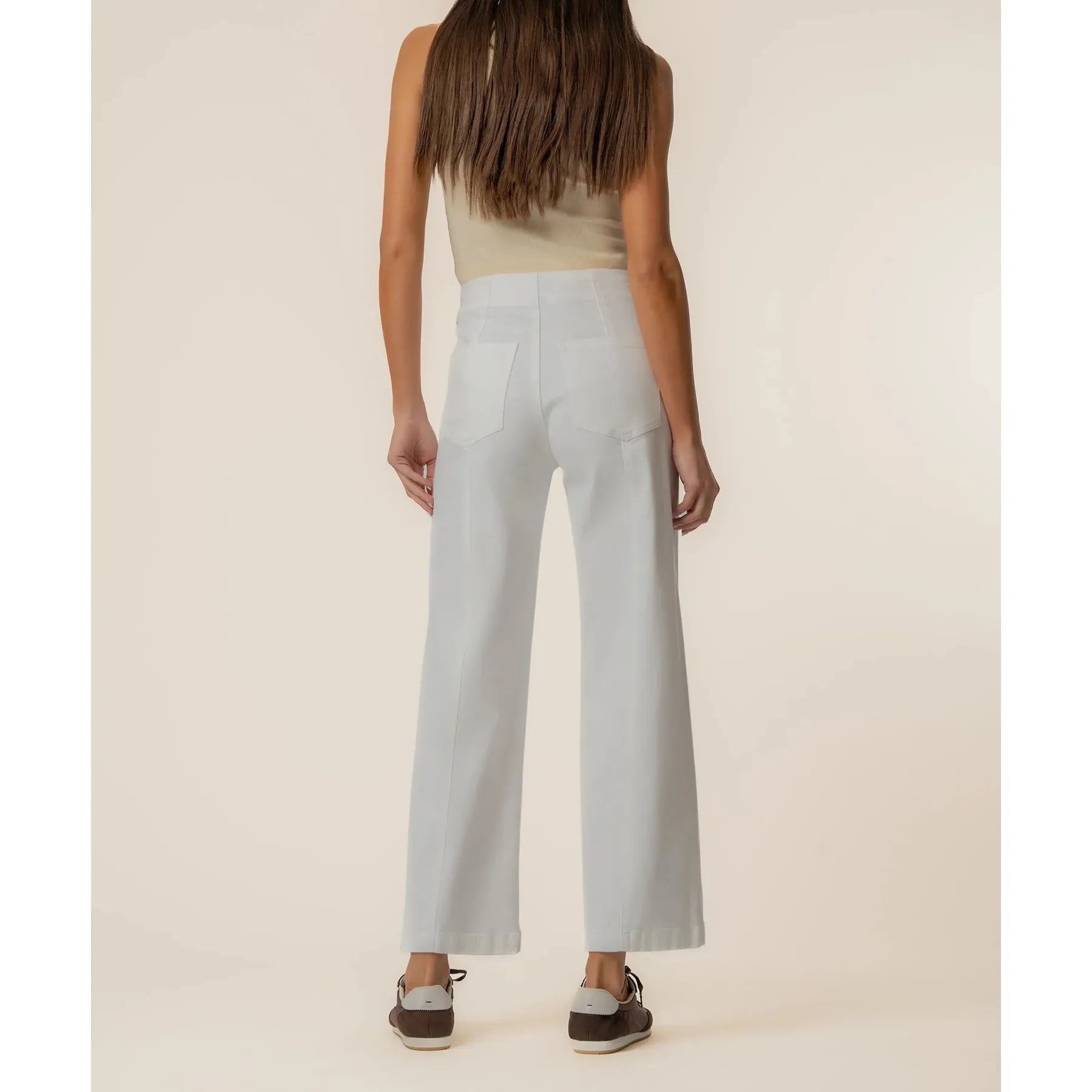 Wide-leg pants that look sharp but feel like you're wearing nothing at all — that's the dream, and the Kut Meg High Rise Wide Leg in White delivers. Crafted from a cotton-stretch blend with a front vertical stitch and tailored welt pockets, this is the pant that makes every outfit look intentional.